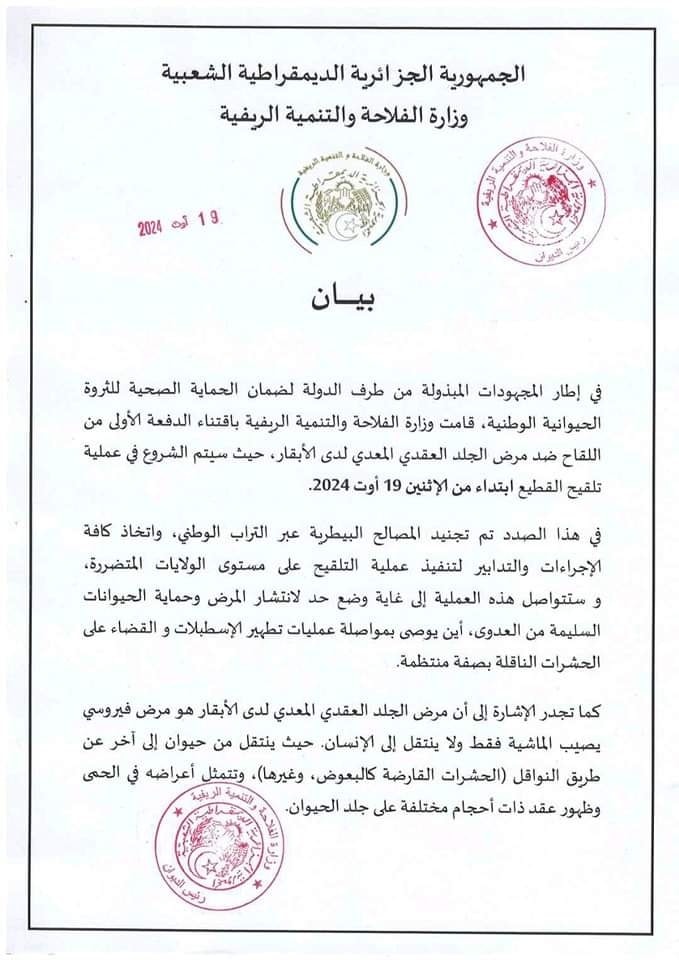 الشروع في حملة التلقيح ضد مرض الجلد العقدي المعدي لدى الأبقار.